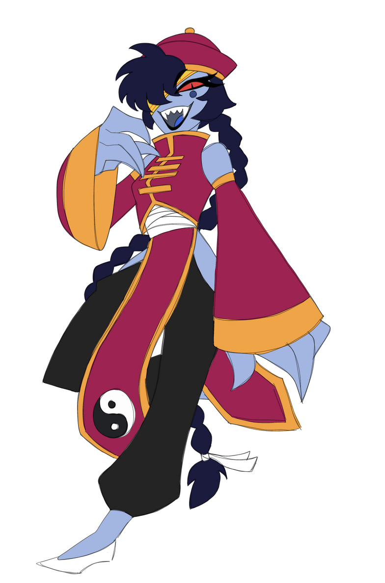 And so, training began. Mistakes were inevitable, as she was just human. But practice makes perfect, as they say! And she practiced plenty. She eventually made herway to performing publicly, drinking in the attention and the growing fame. As her popularity grew, so did her greed and her jealousy of her peers. She strived to climb to the top of the totem pole. But little did she know, this would quickly become her downfall. A rare occurrence happened: A Jian Wu duet. While she had practiced for this, what she wasn't expecting was her spotlight becoming a show to her death.They danced, but too close. Blades extended, they improvised... But the second time, her blade went up while his went... Down. Right through her stomach and out her back. Medicine was at an all-time low during this time period of the 1950s, the wars having made them scarce and so... An injury of that caliber was fatal. WHILE IN HELL Waking up in Hell, she was terrified. She had been taught about Diyu, the Chinese Hell, but this was.... Different. She wasn't being judged by the Yama, she wasn't being dragged away to a Kingdom of Hell befitting of her sins... No. She was... A Jiangshi? A vampire? A zombie? Perhaps it was her greed that caused this, but she had such an insatiable hunger for blood and flesh. Perhaps a consequence of her bleeding out on the stage after her stabbing. Or the fact she never had enough to eat while alive...Either way, the longer she was "alive" in this Hell, the more insane she went. Seeing as acts of sins were acted upon without hesitation, having to defend herself, being able to... Do what she wanted? Without consequences? This was absolutely healthy for her mentality... Surely.